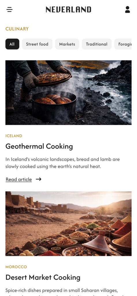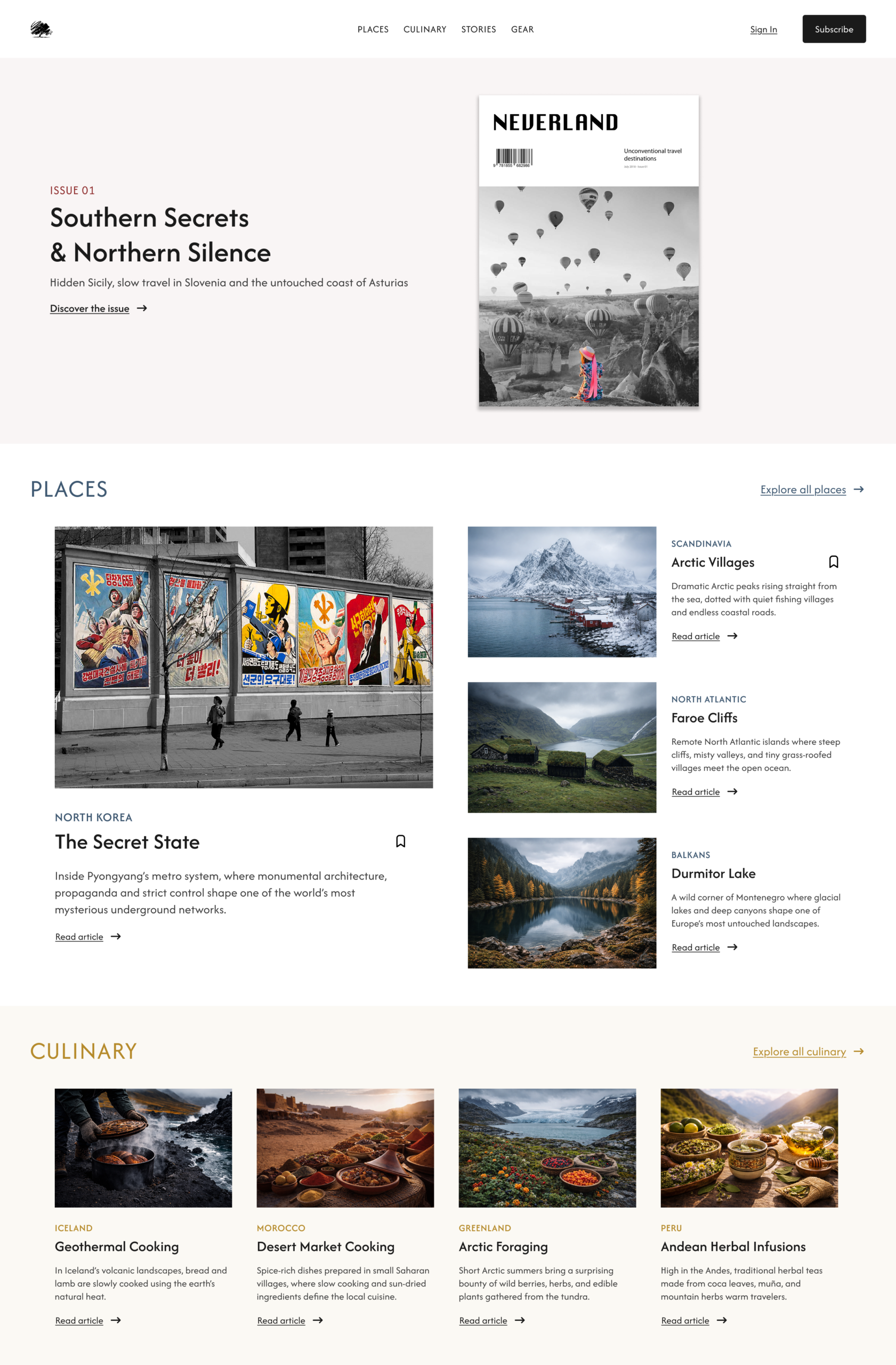 Inspired by the structure of independent travel magazines, the layout combines immersive photography with a clear editorial grid, guiding users through destinations, stories and curated content while maintaining a calm reading experience.