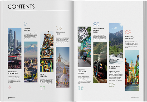 • The contents page organizes destinations through a clear editorial hierarchy, helping readers quickly navigate the stories